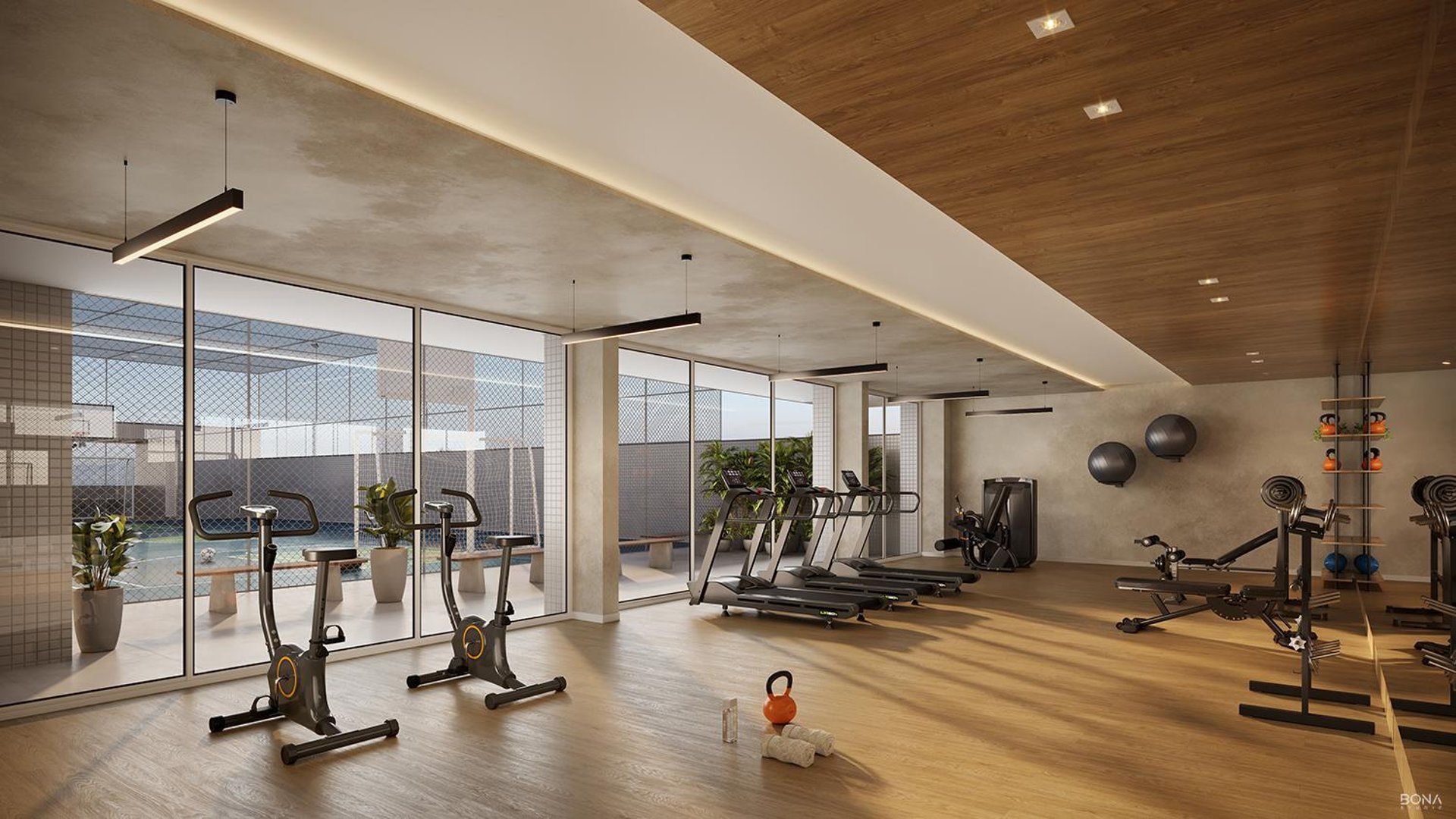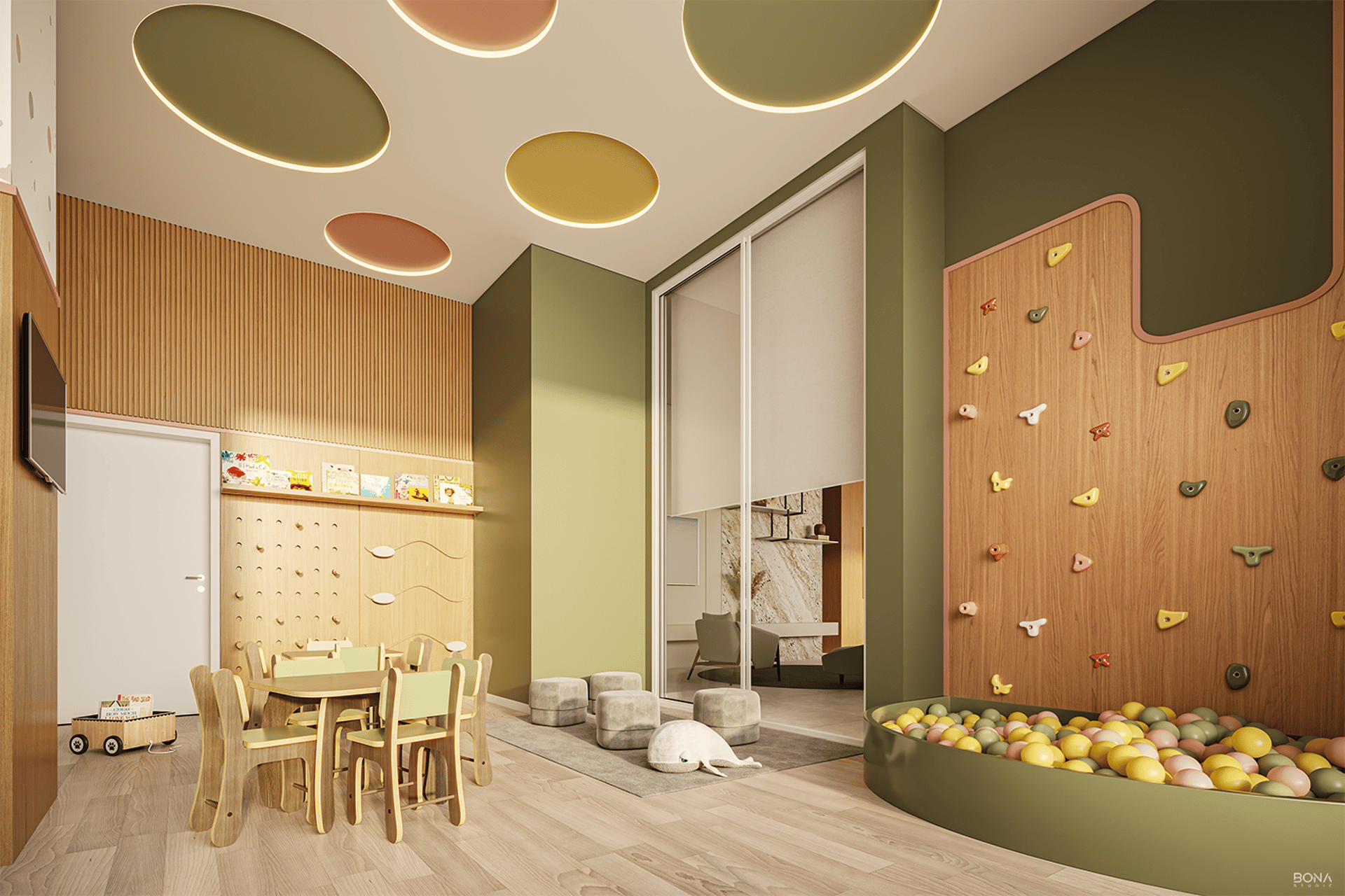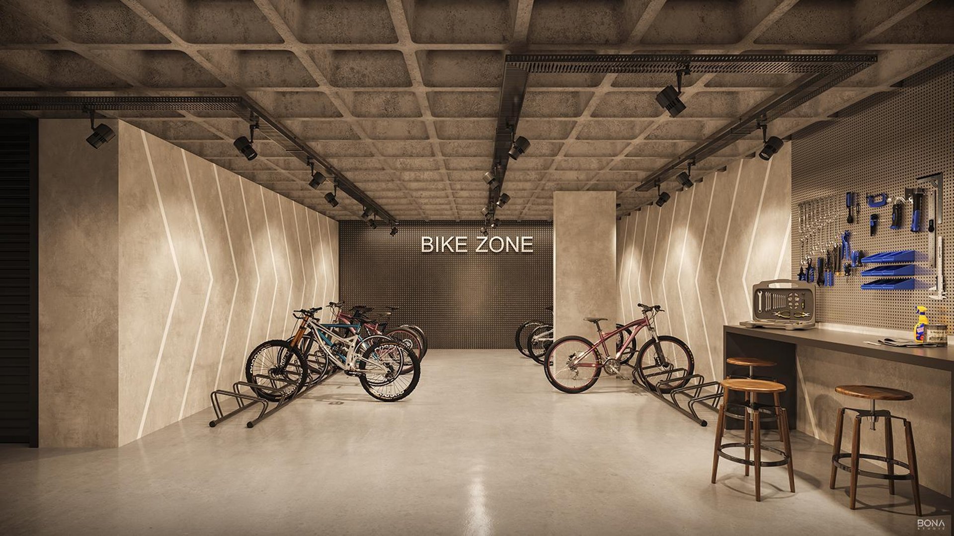 Quadra poliesportiva e sala de jogos trazendo opções de lazer ativo para todas as idades, espaço kids, espaço office, bicicletário no pavimento térreo, entre outros.