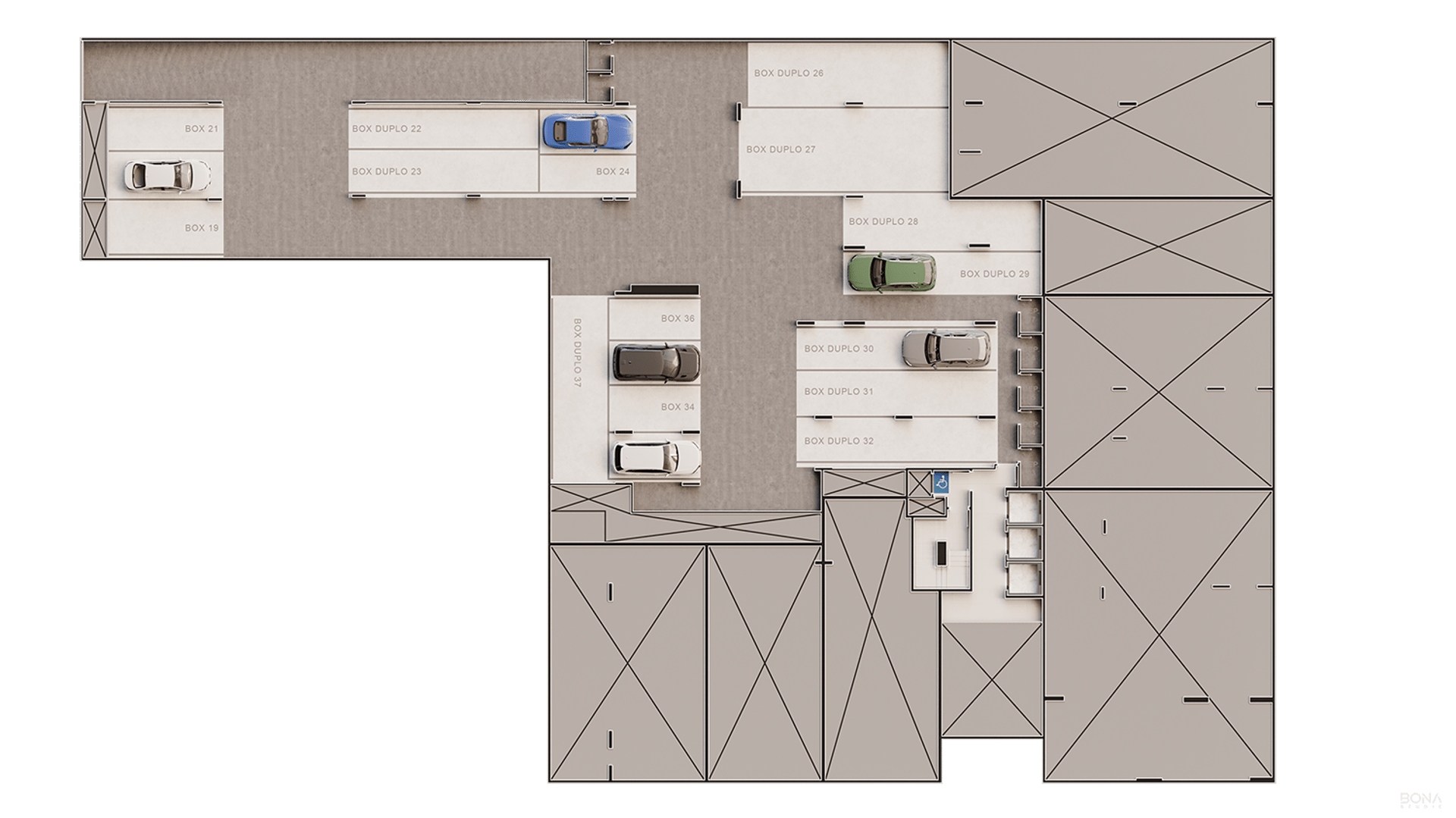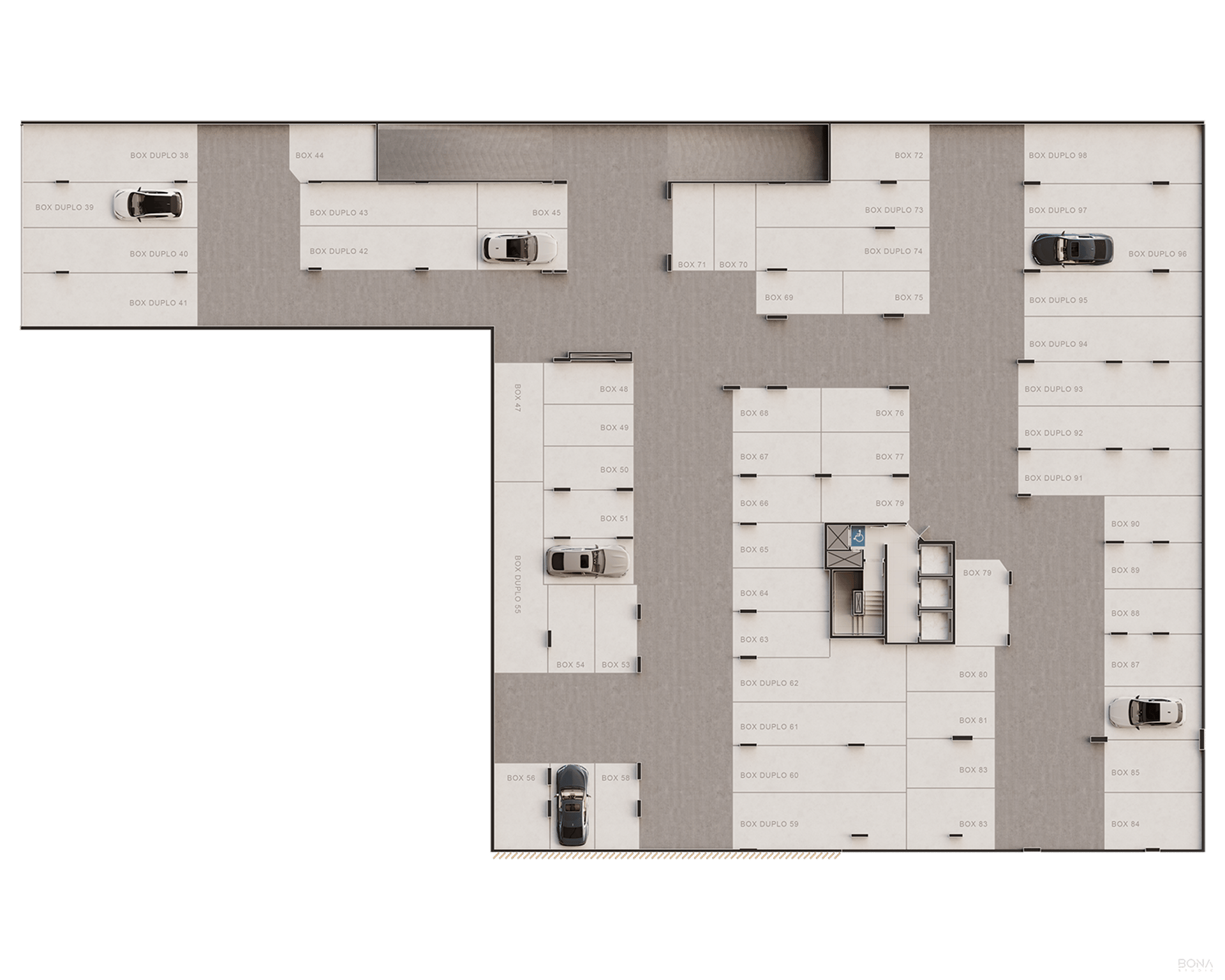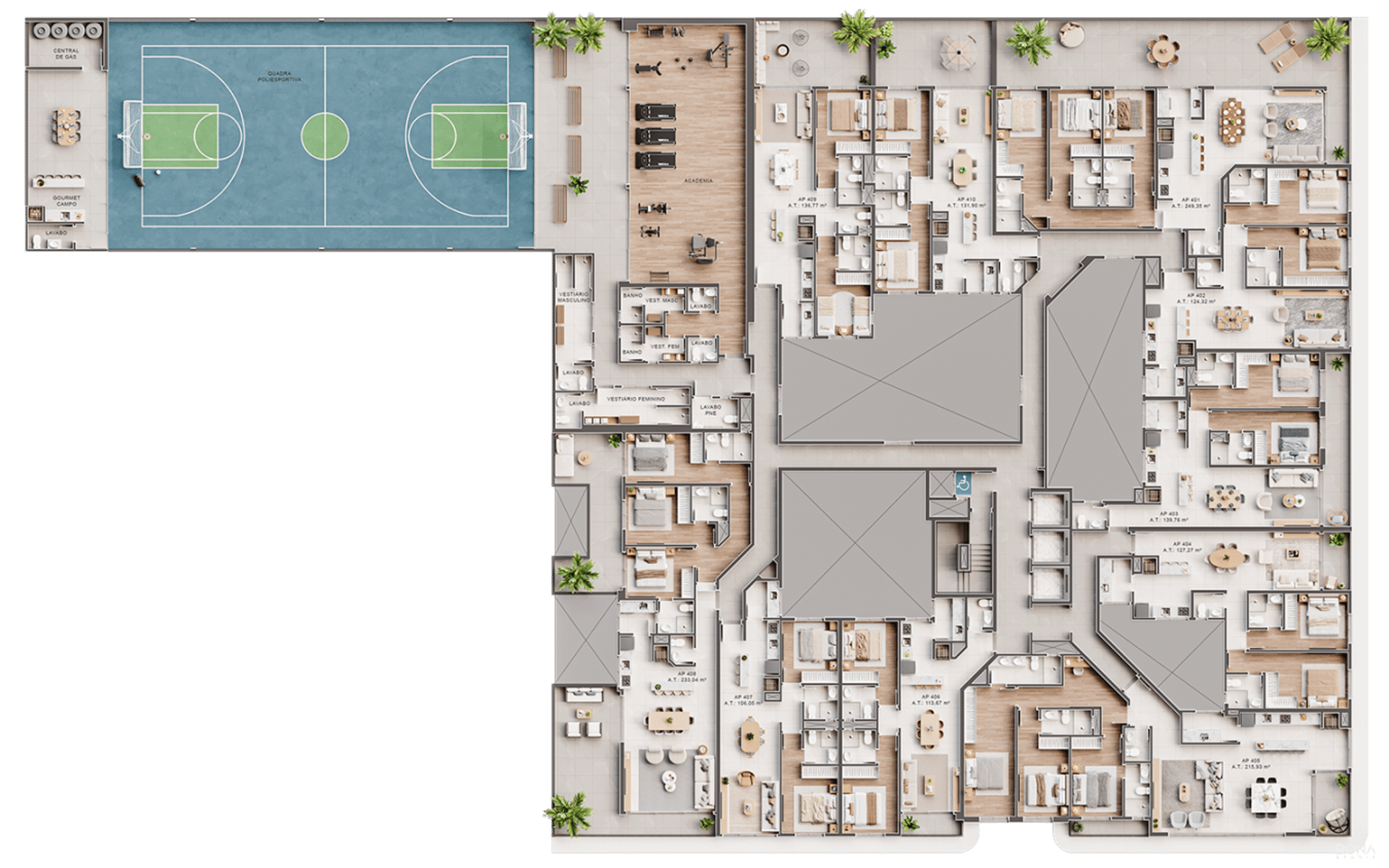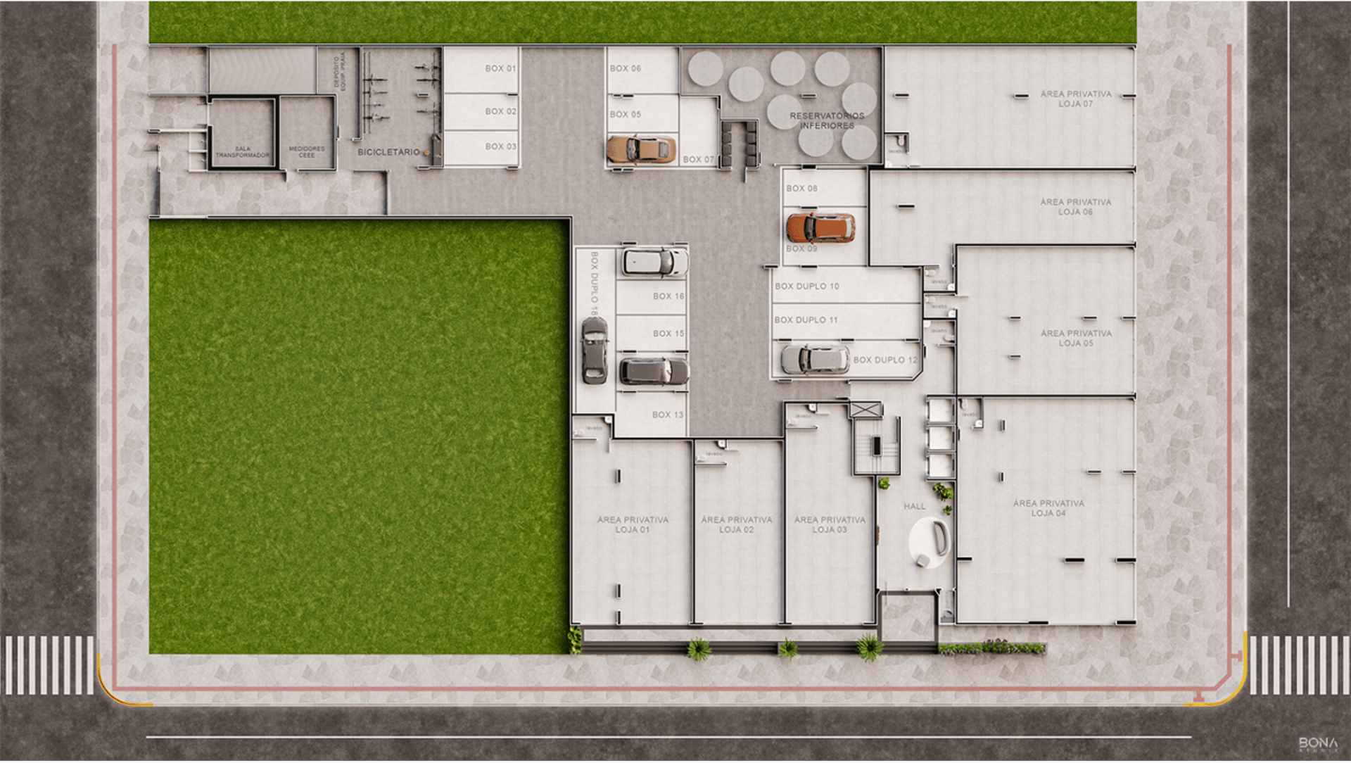 Quadra poliesportiva e sala de jogos trazendo opções de lazer ativo para todas as idades, espaço kids, espaço office, bicicletário no pavimento térreo, entre outros.