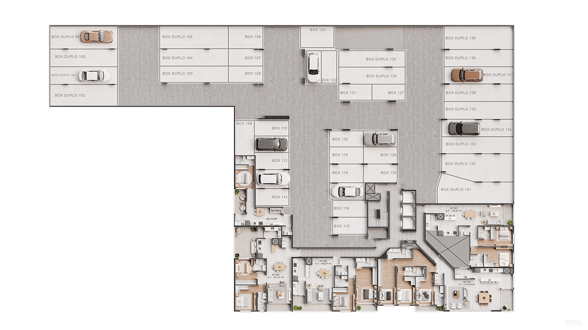 Total de 130 apartamentos, 139 boxes de garagens e rooftop localizado no 15º pavimento.