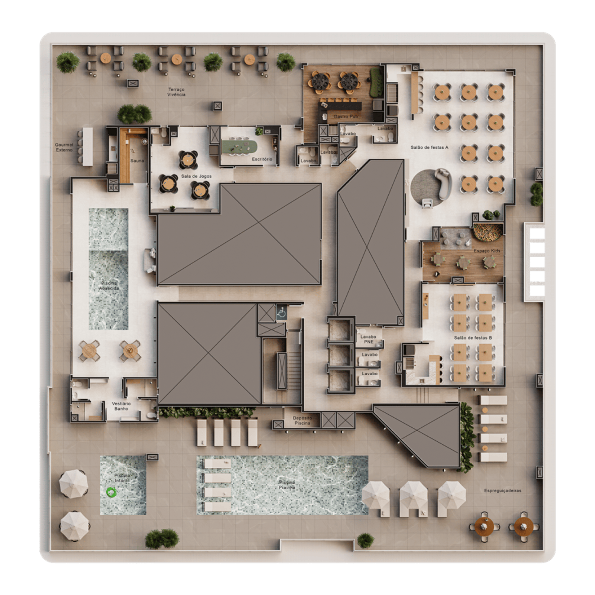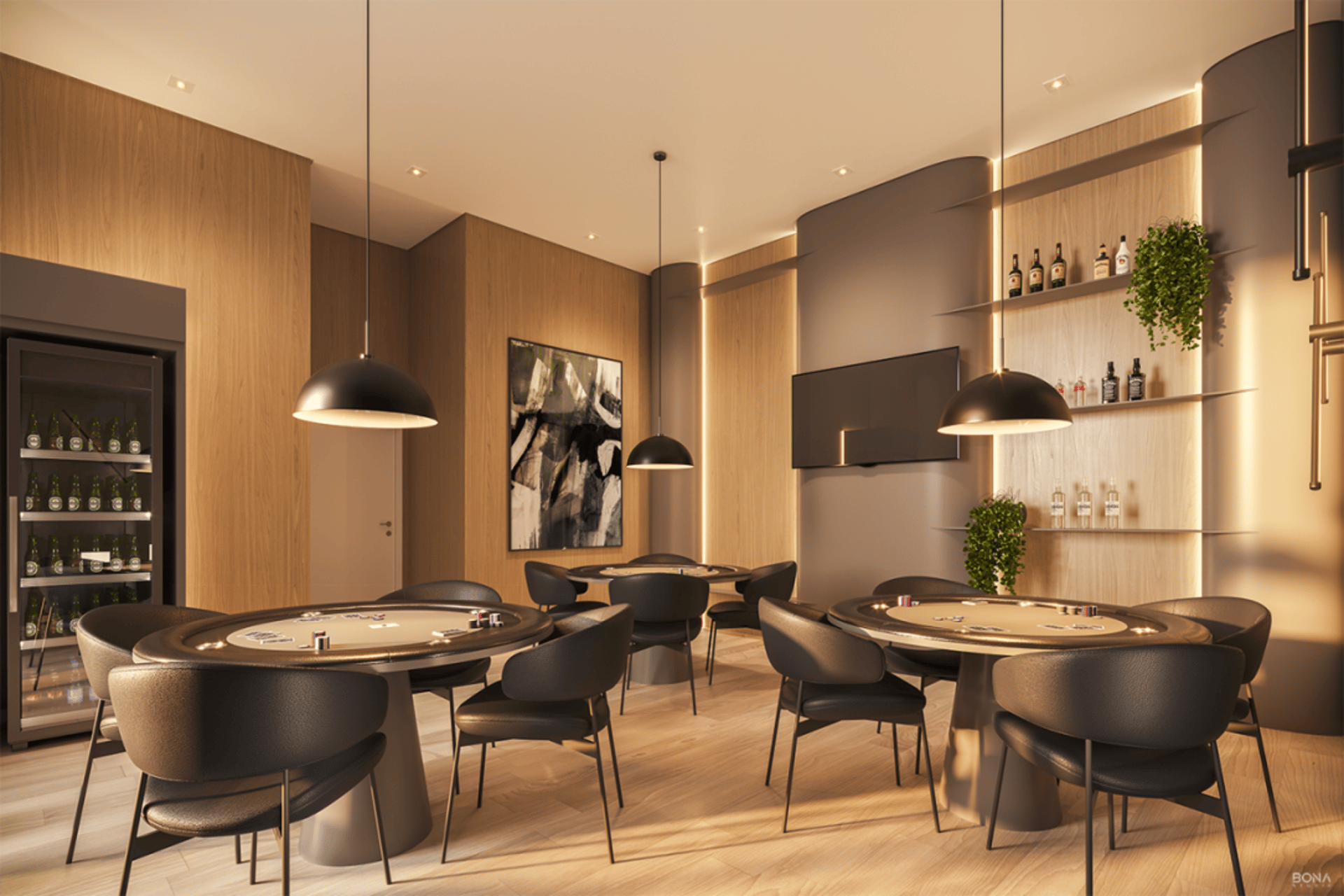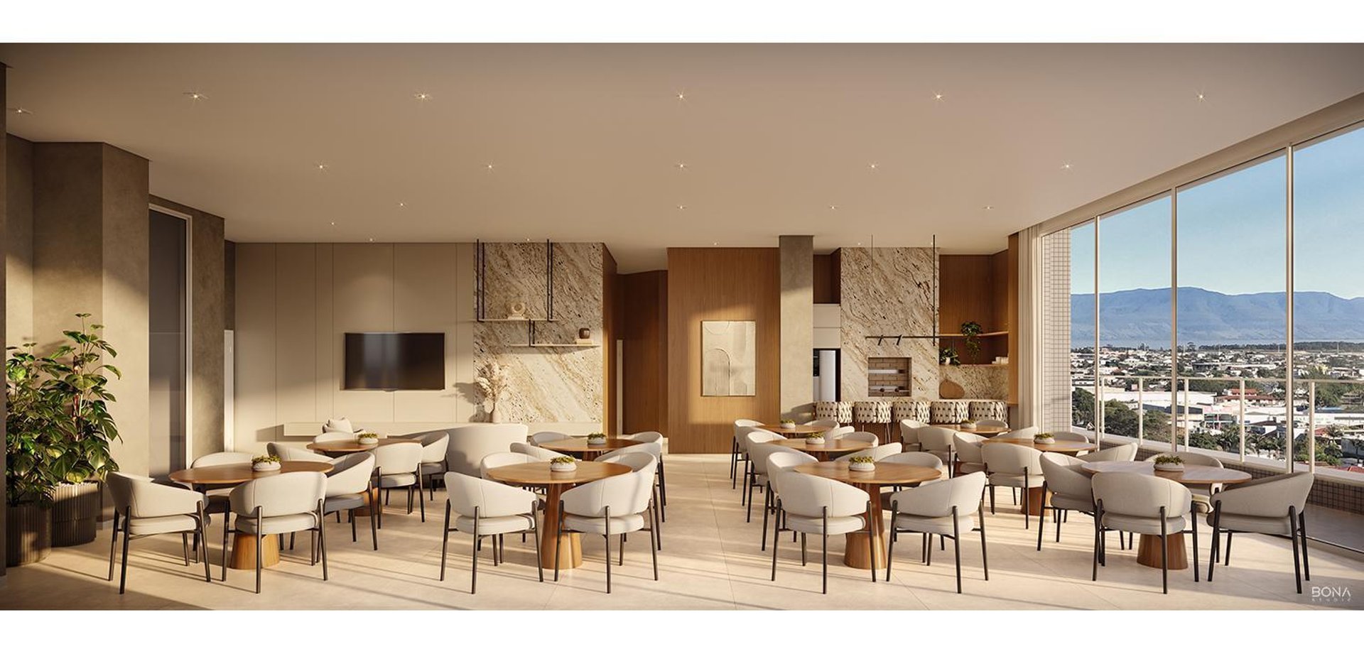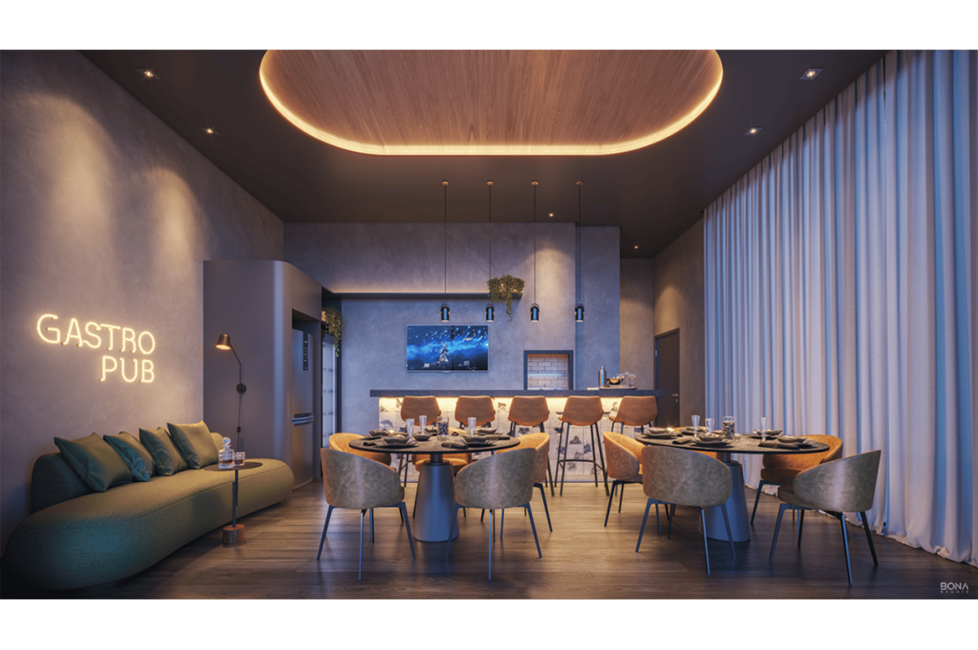 Rooftop 360º com mais de 1.000 m² de área com vista panorâmica, dois salões de festas, gastropub, área gourmet, lounge sunset, entre outros.