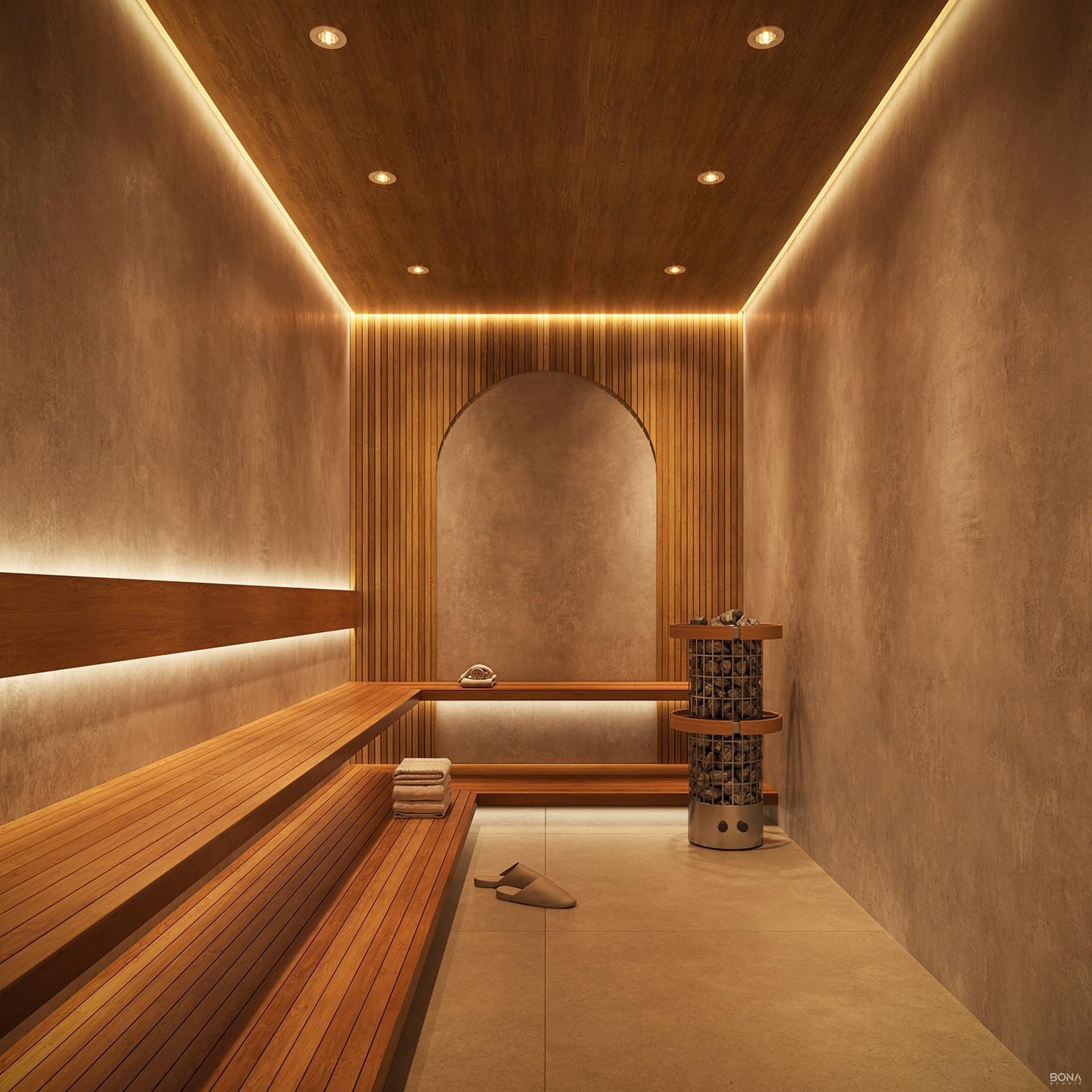 Sauna e terraço de vivência, complexo aquático que inclui piscina térmica coberta, piscina infantil e prainha, entre outros.