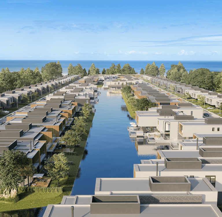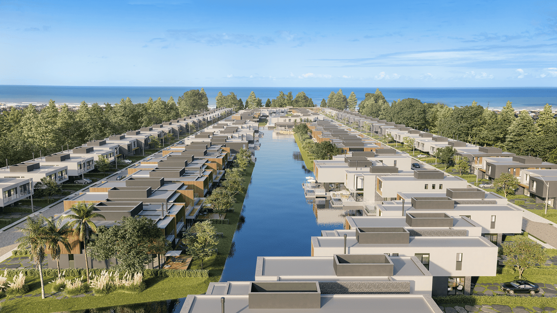 Condomínio exclusivo de casas prontas de alto padrão, com design arquitetônico que mistura elementos naturais como pedra e madeira.