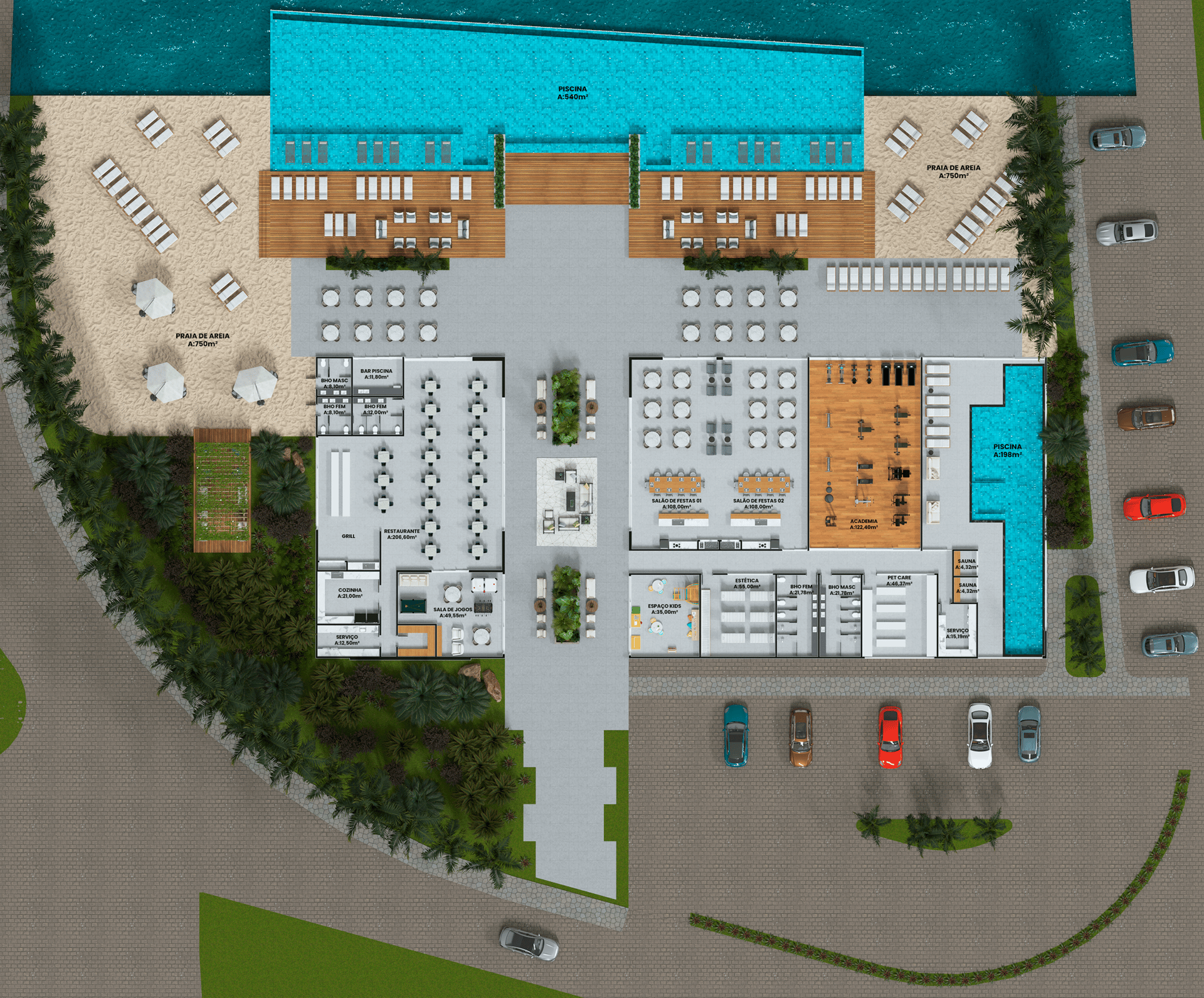Inspirado no "Garden Living", prioriza o paisagismo e áreas verdes. Oferece estrutura de apoio na praia.