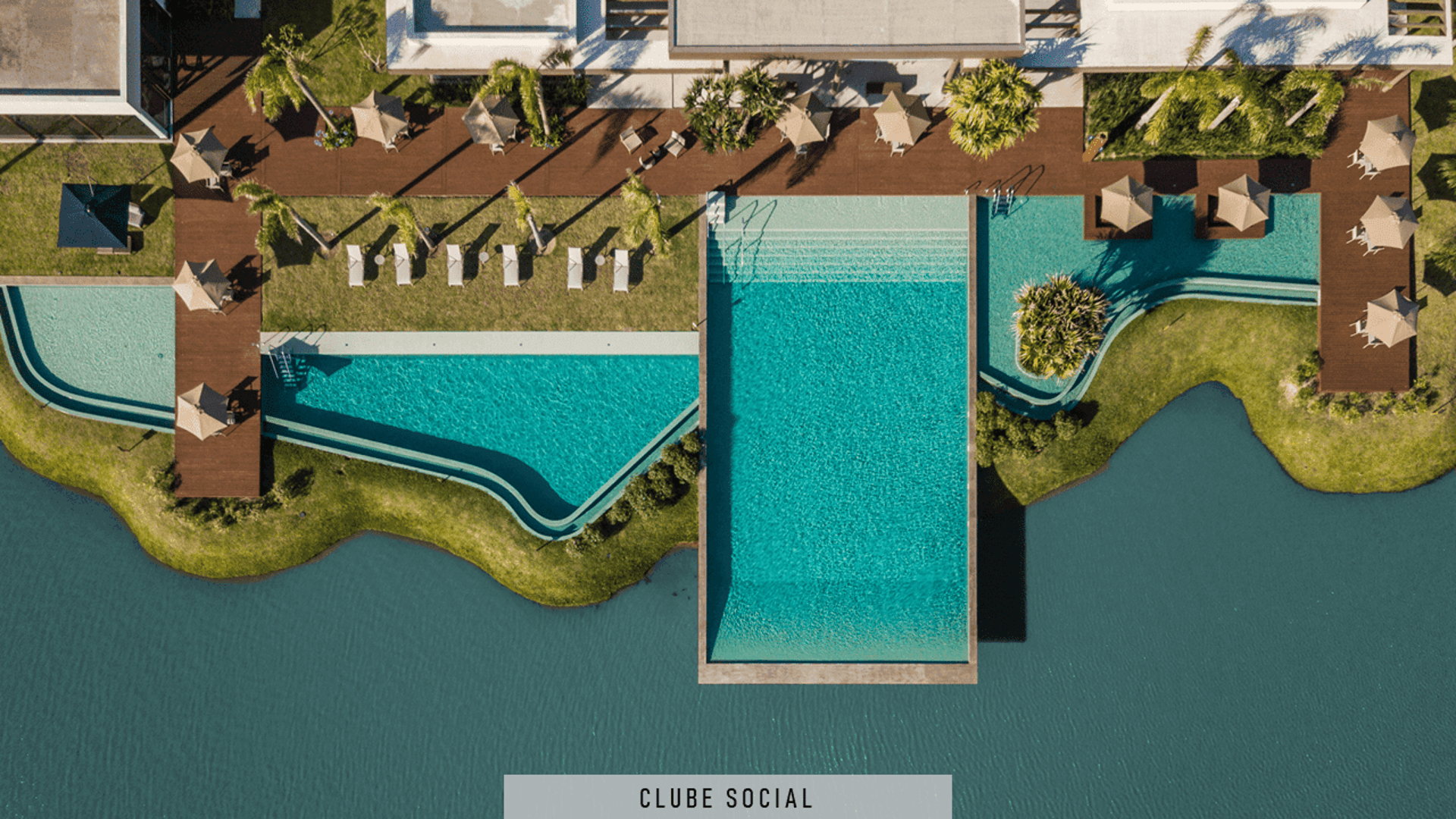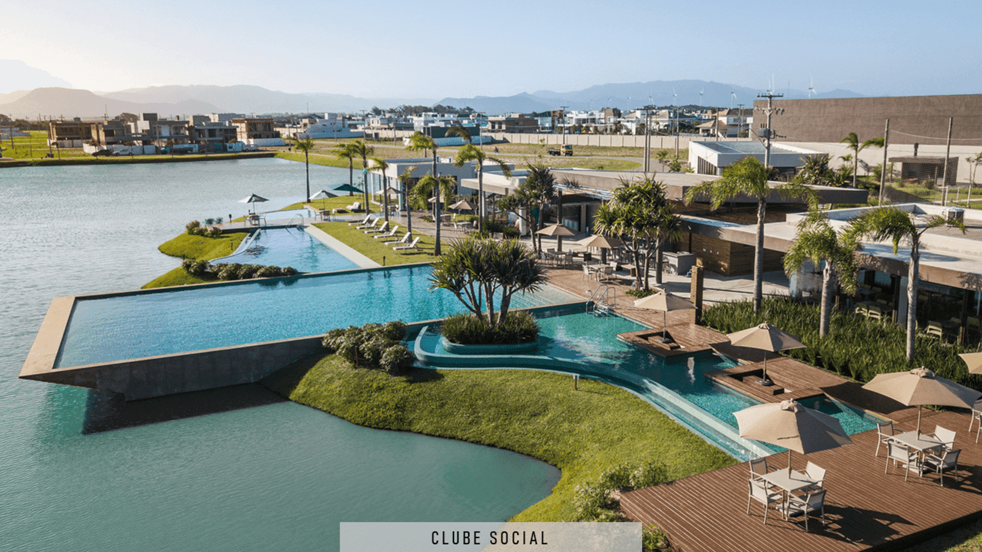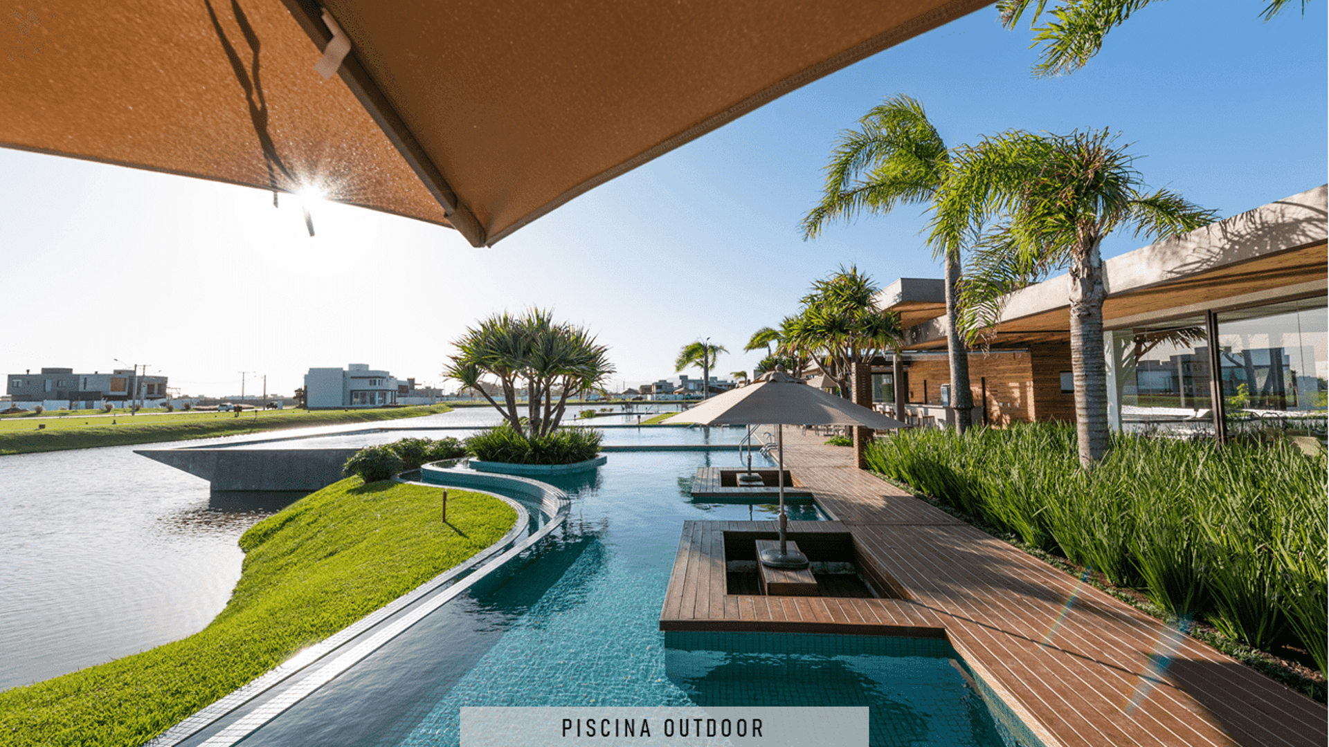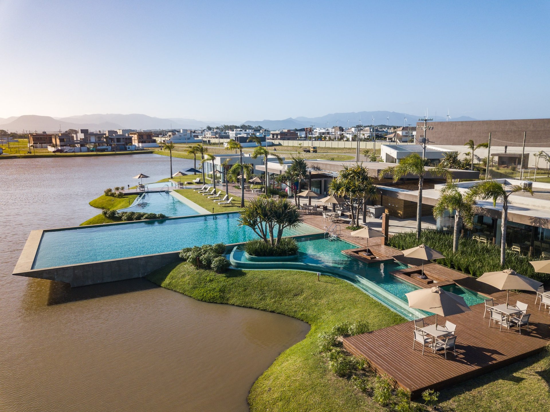 Piscinas externas com decks e pergolados.