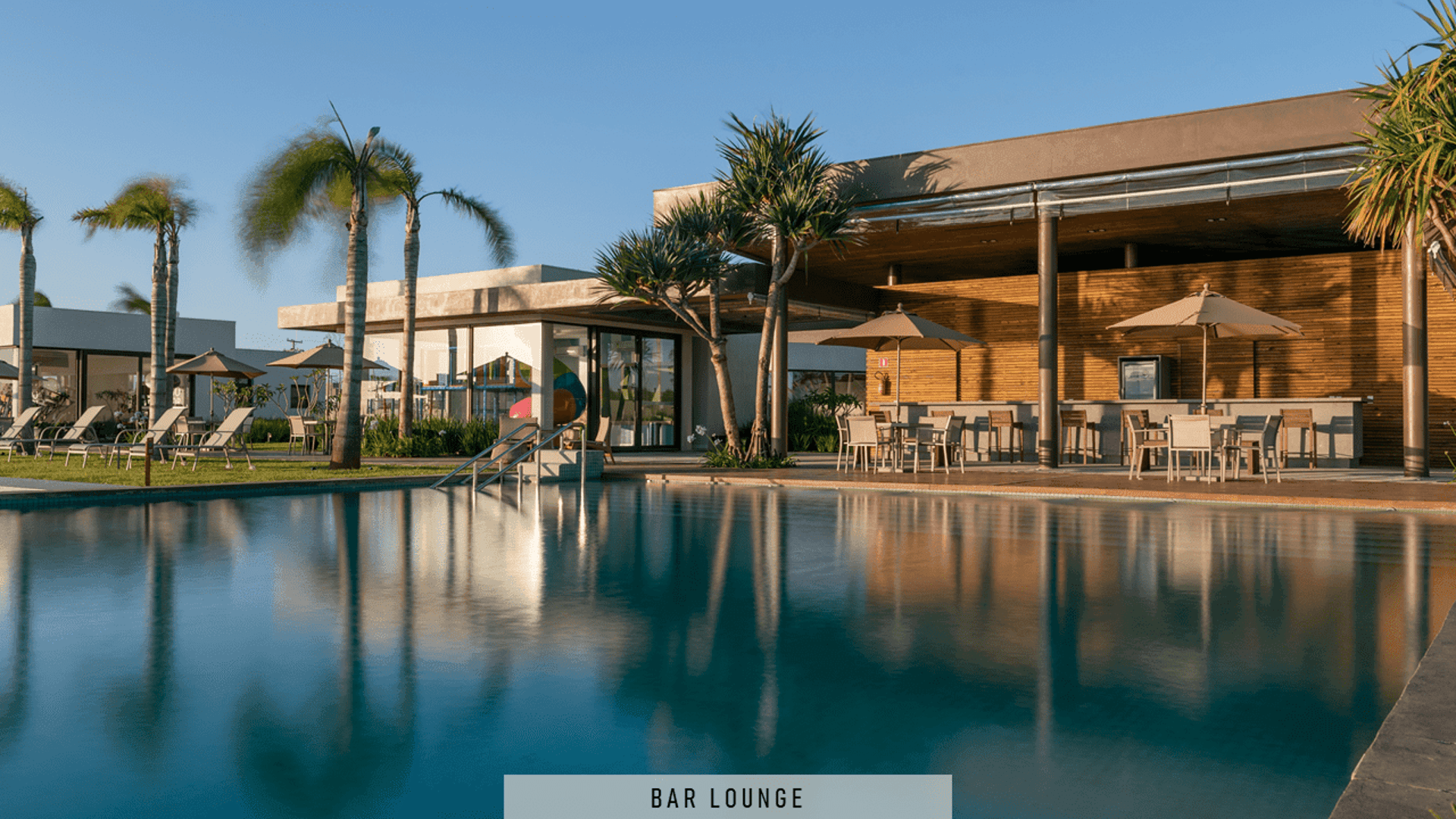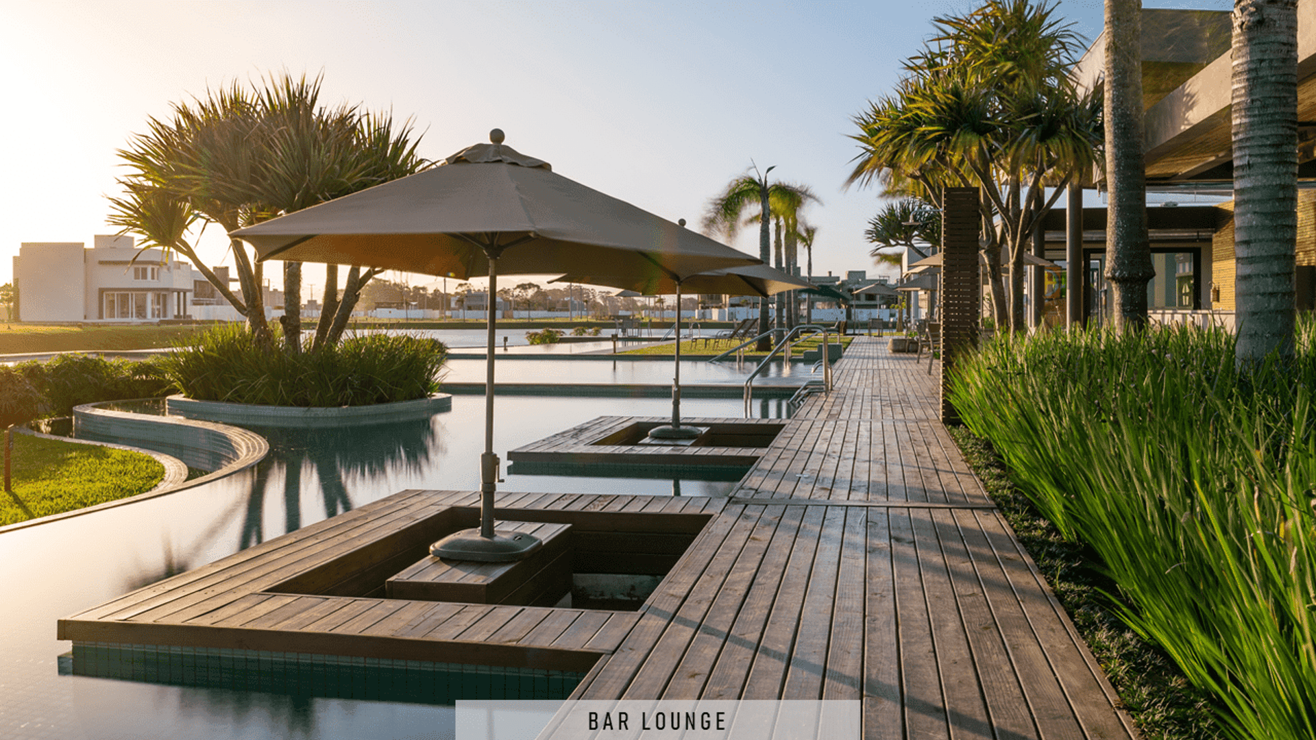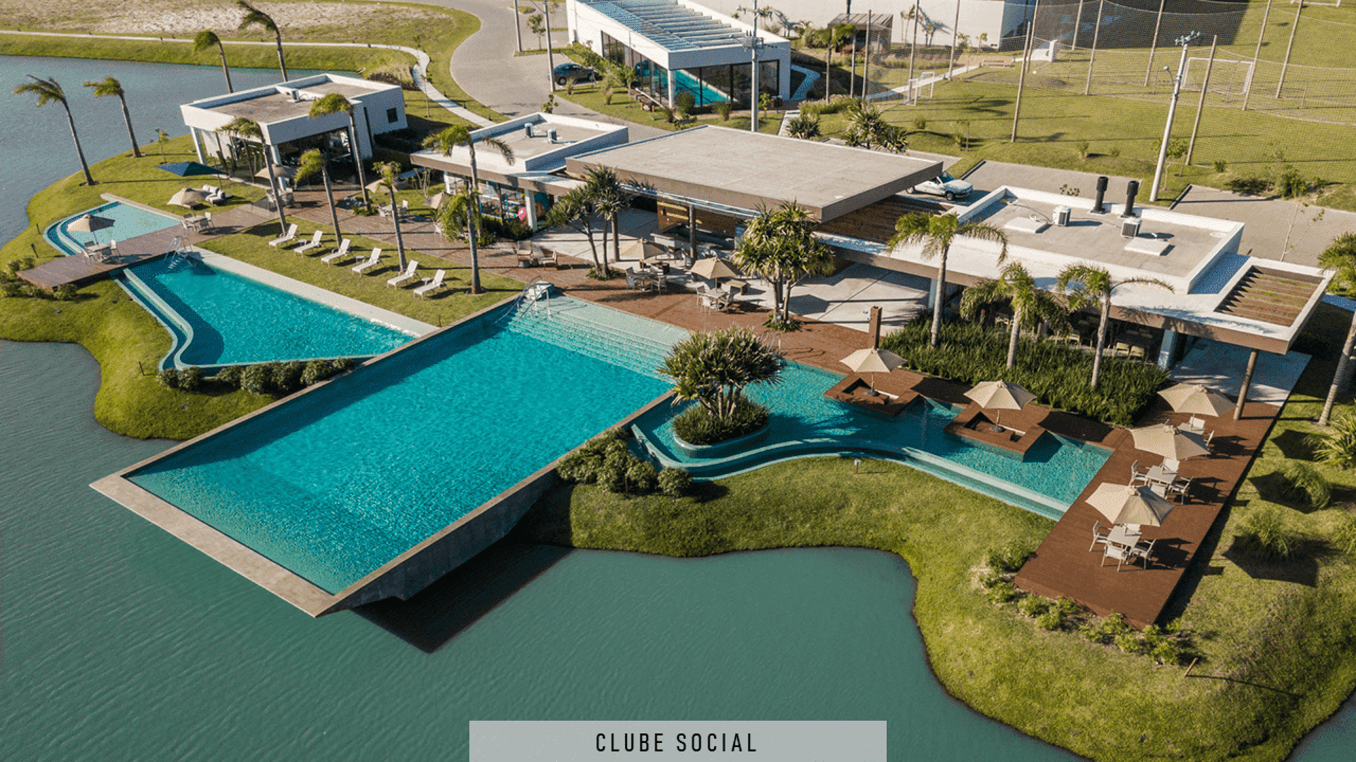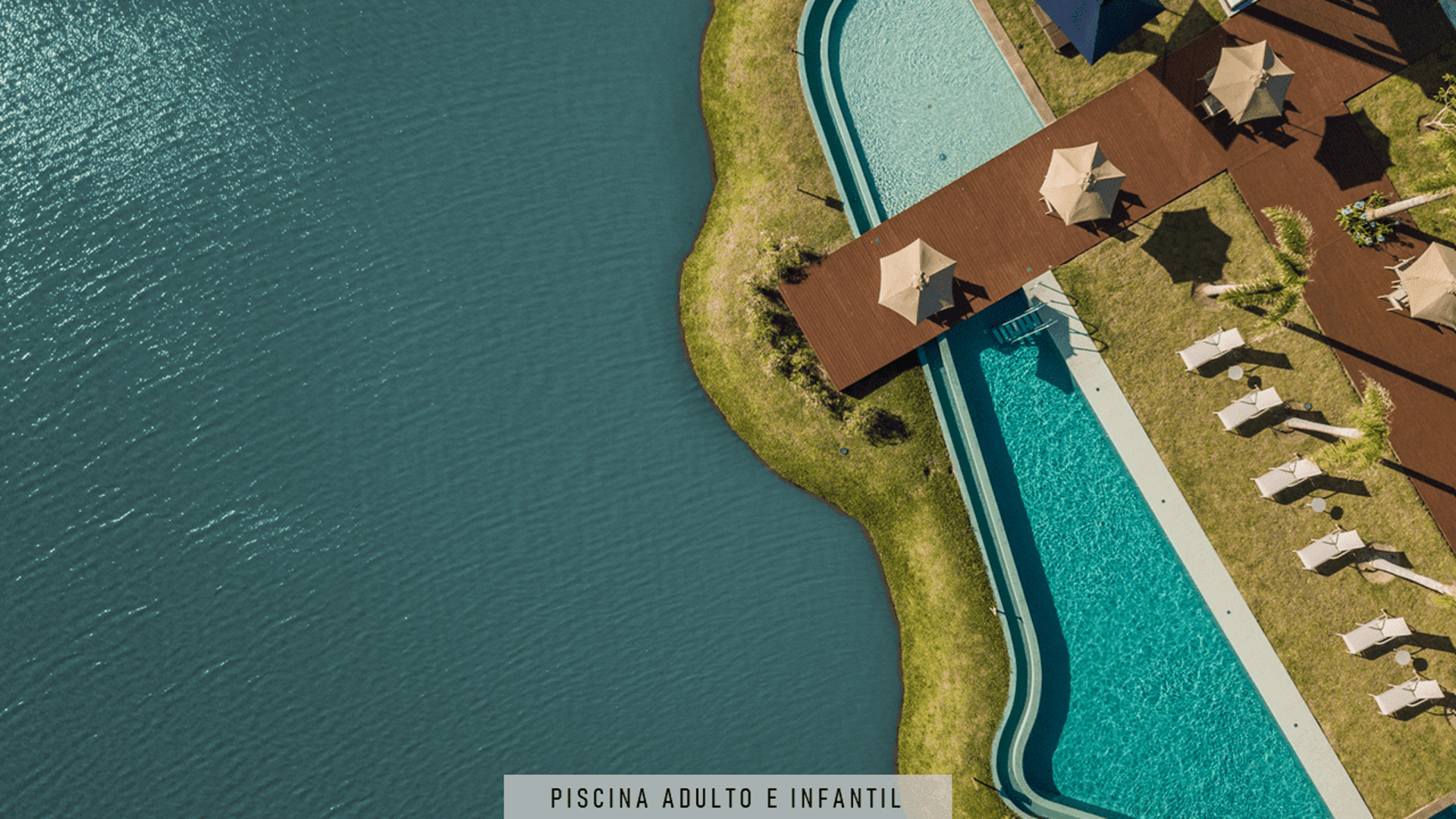 Piscinas externas com decks e pergolados.