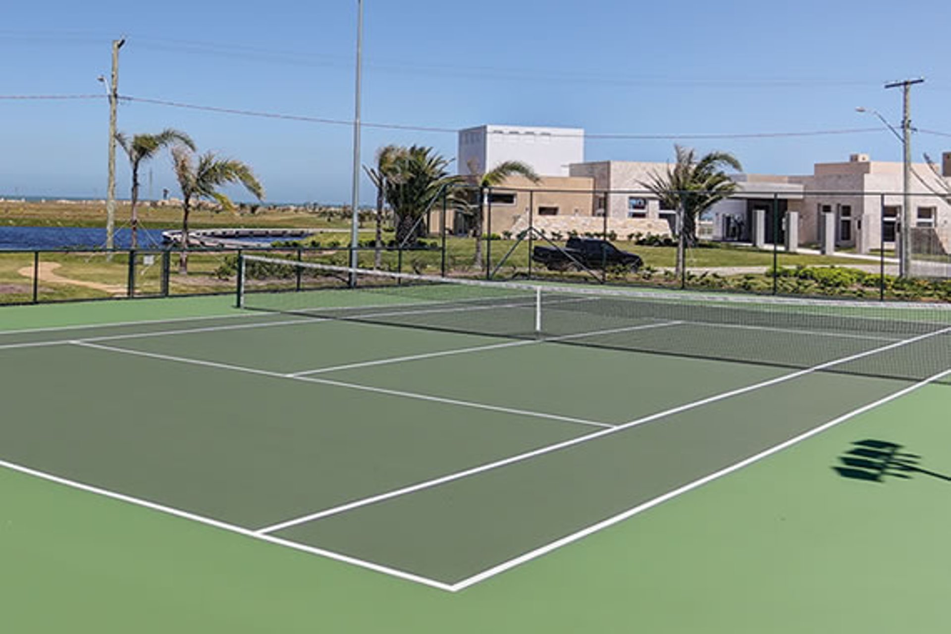 Quadra de tênis coberta (saibro) e descoberta (sintética).