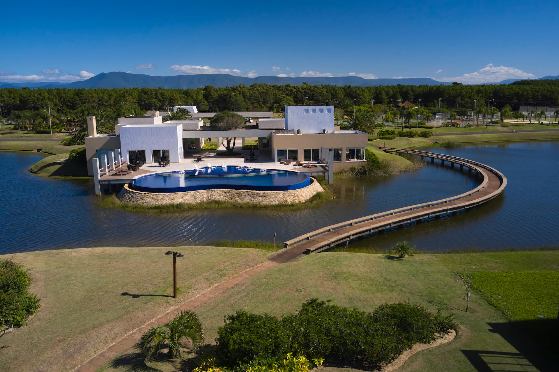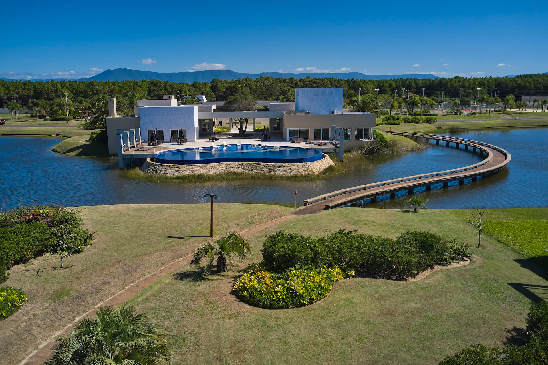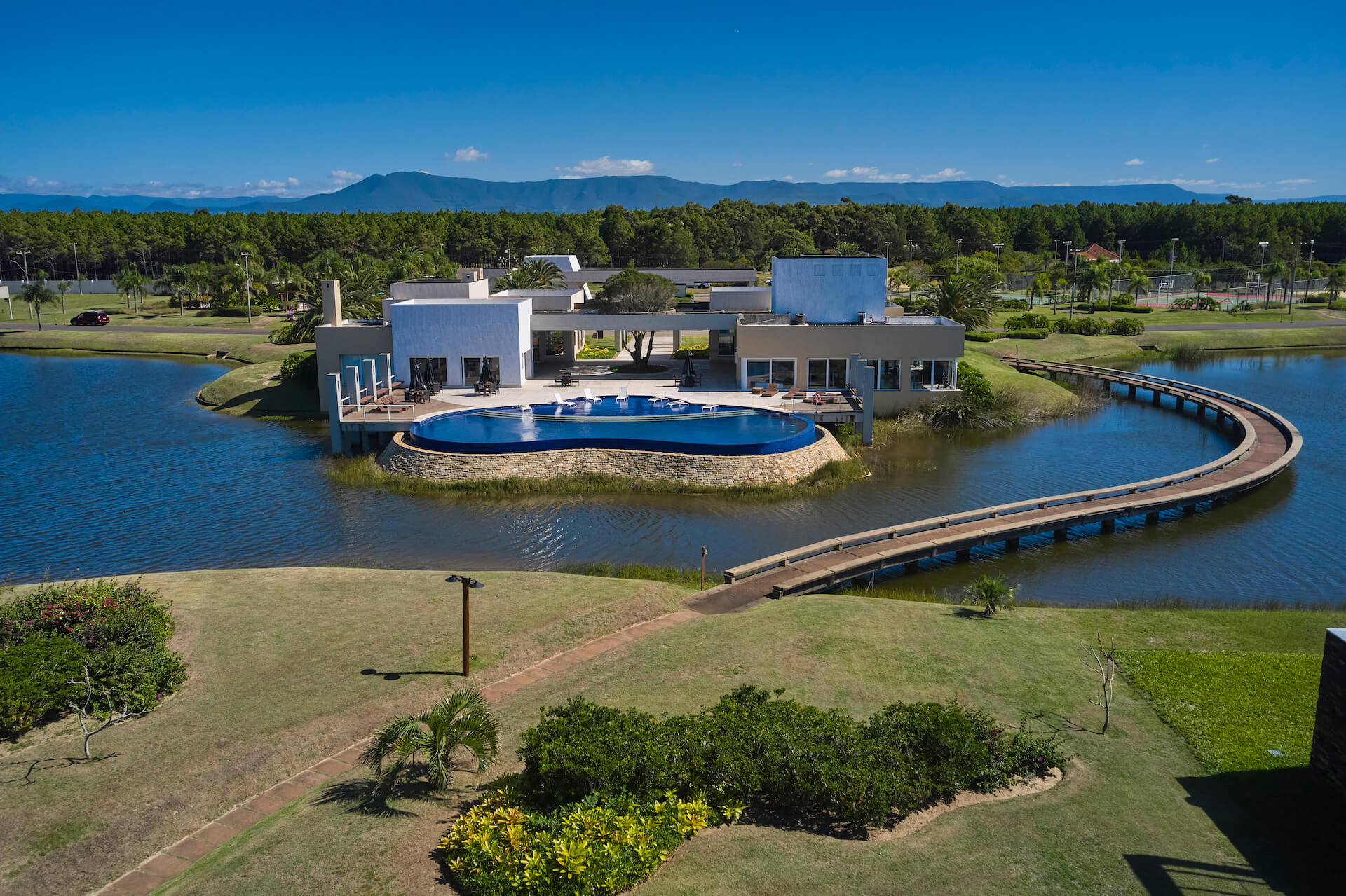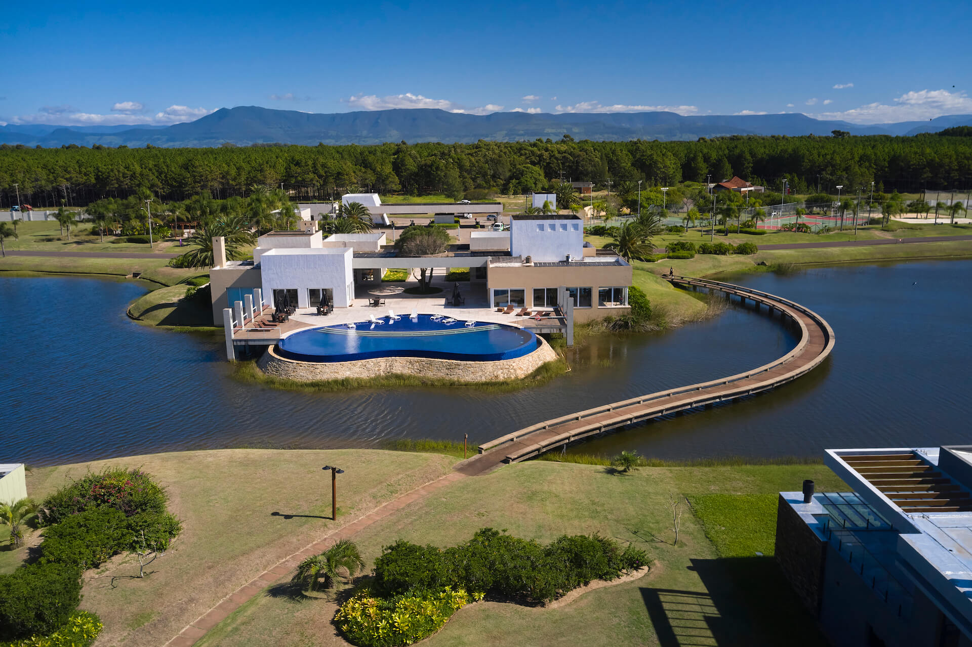 Clube social com piscina de borda infinita à beira do lago.