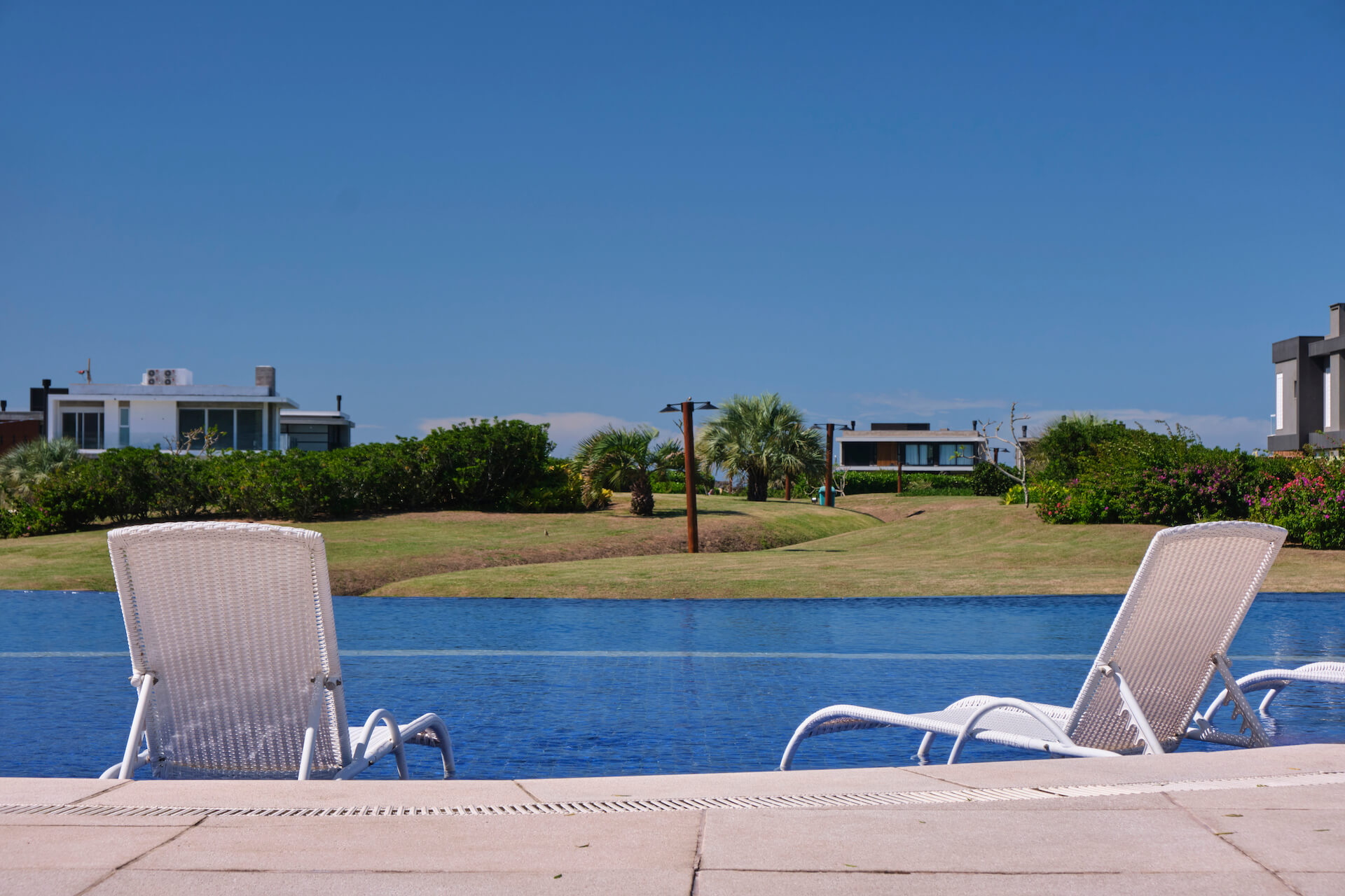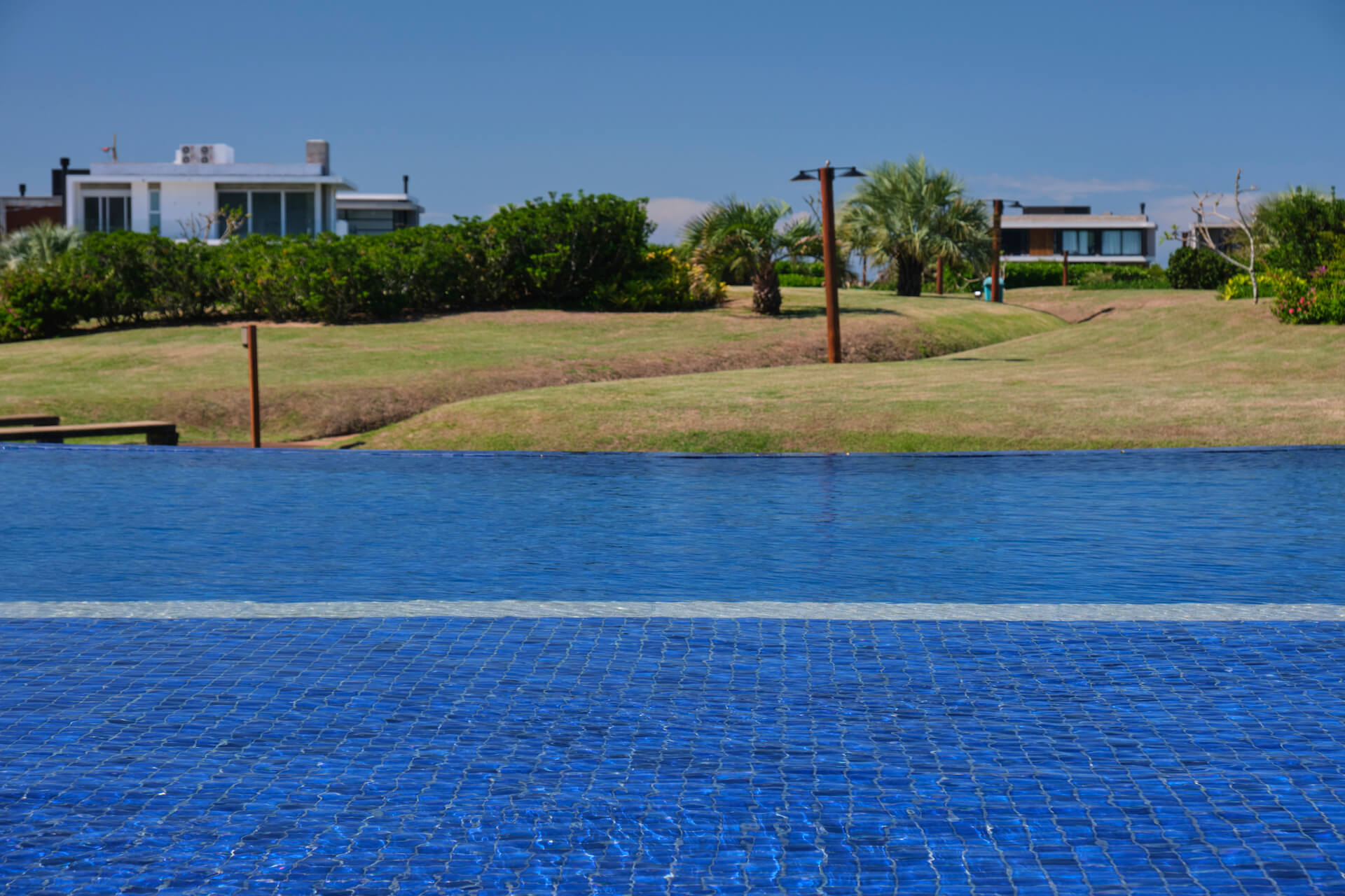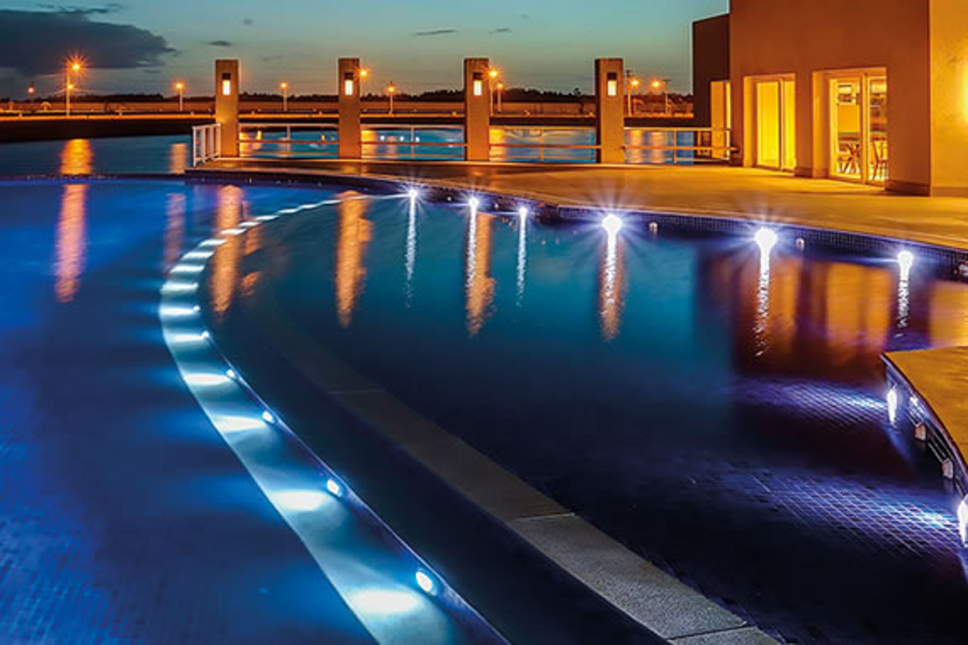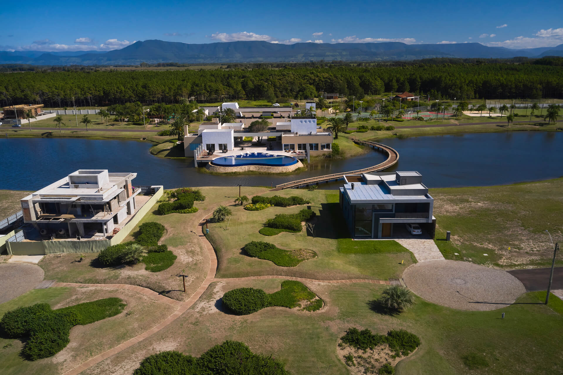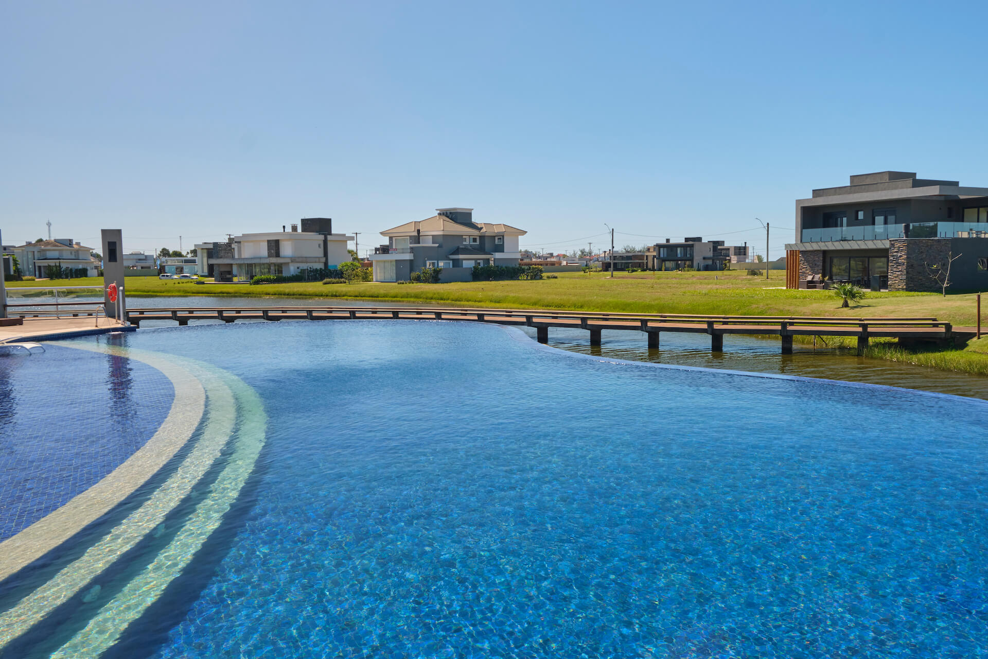 Clube social com piscina de borda infinita à beira do lago.