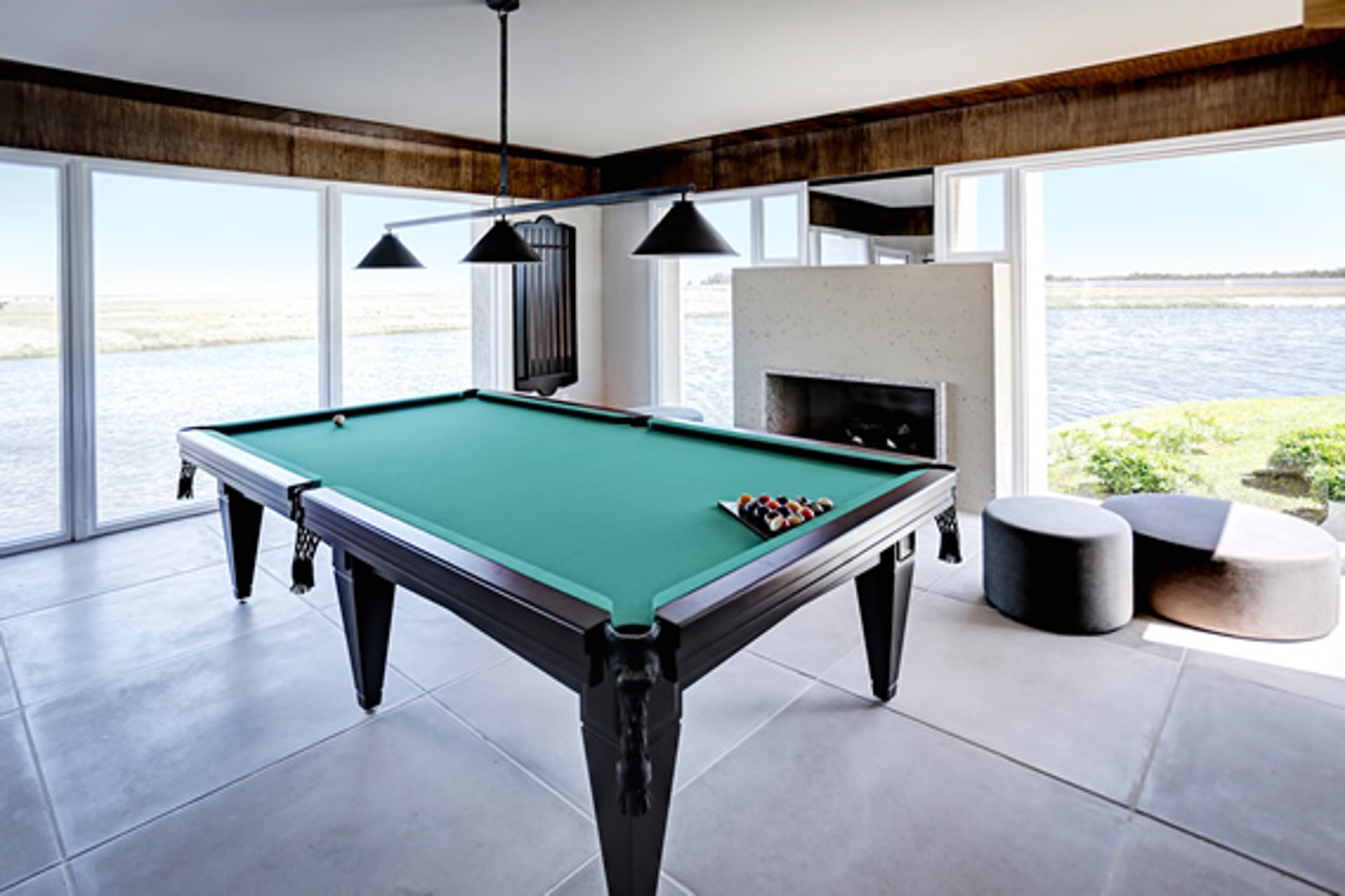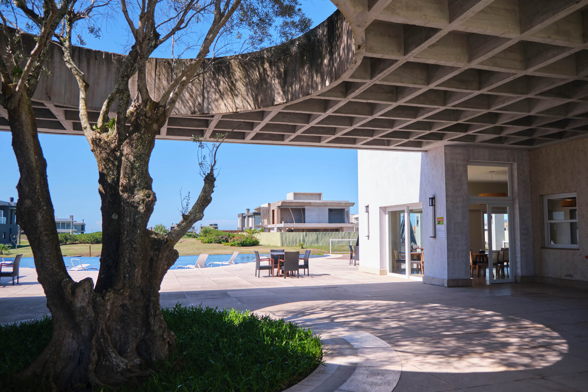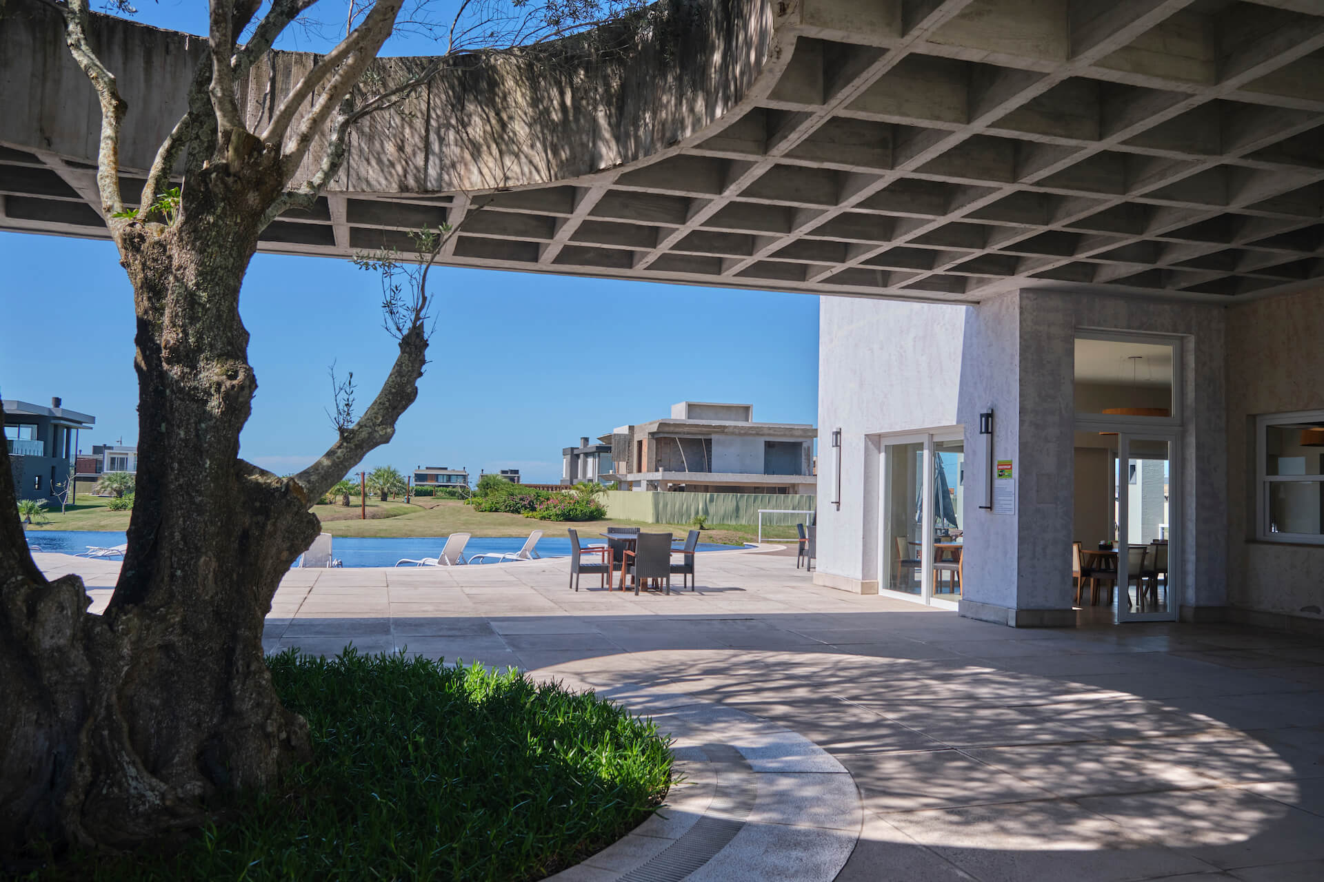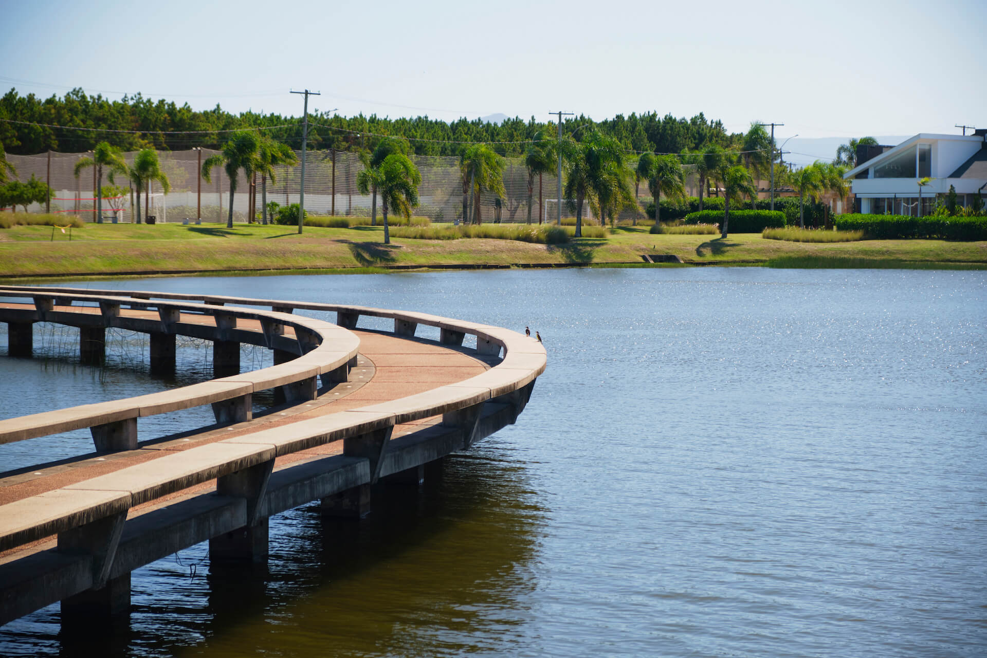 Clube social com piscina de borda infinita à beira do lago.
